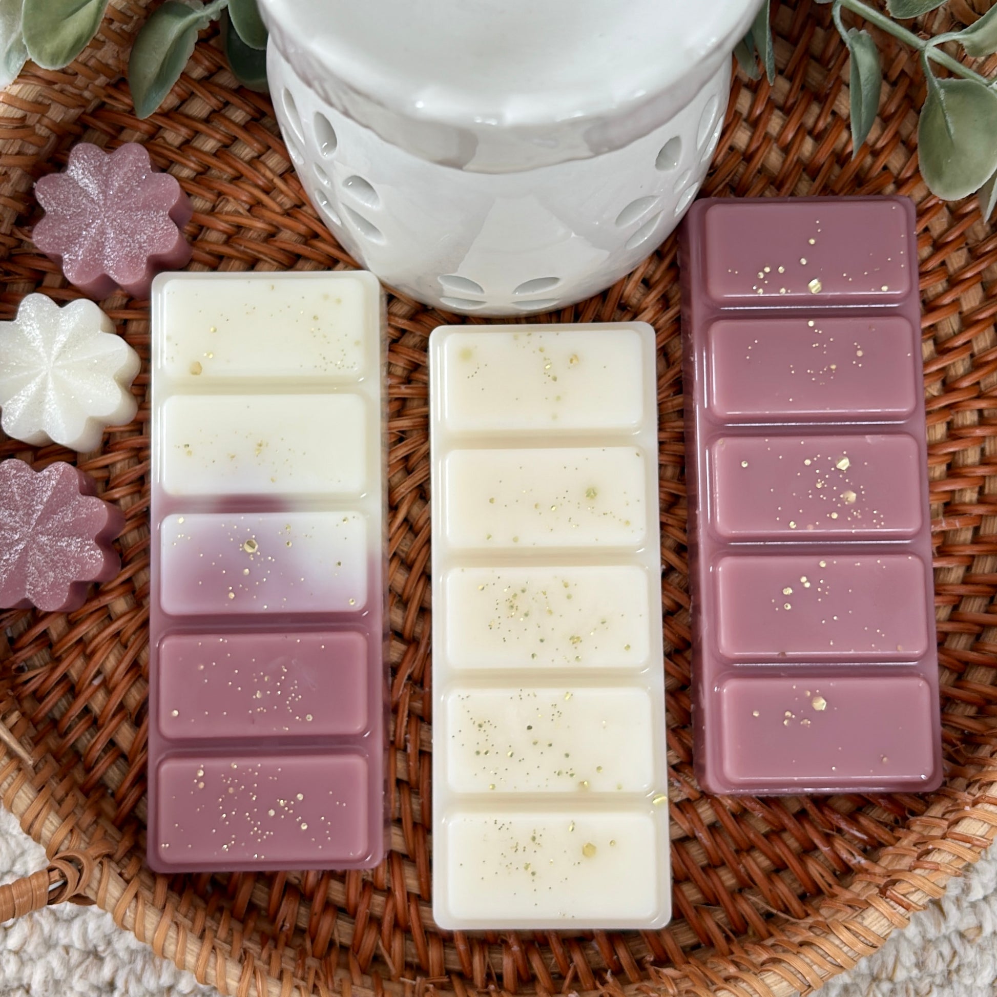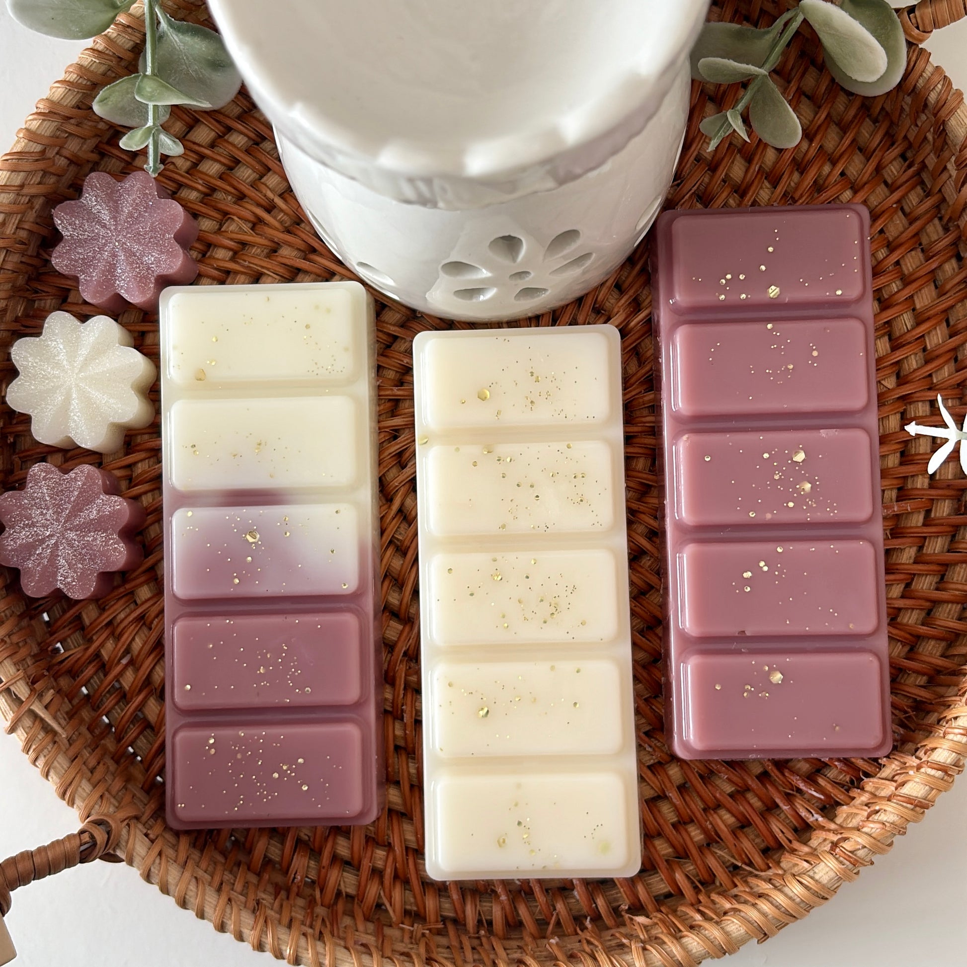 You will receive 1 wax melt burner, 3 snap bars, 3 flower wax melts and 2 tea lights presented in a white gift box and satin ribbon