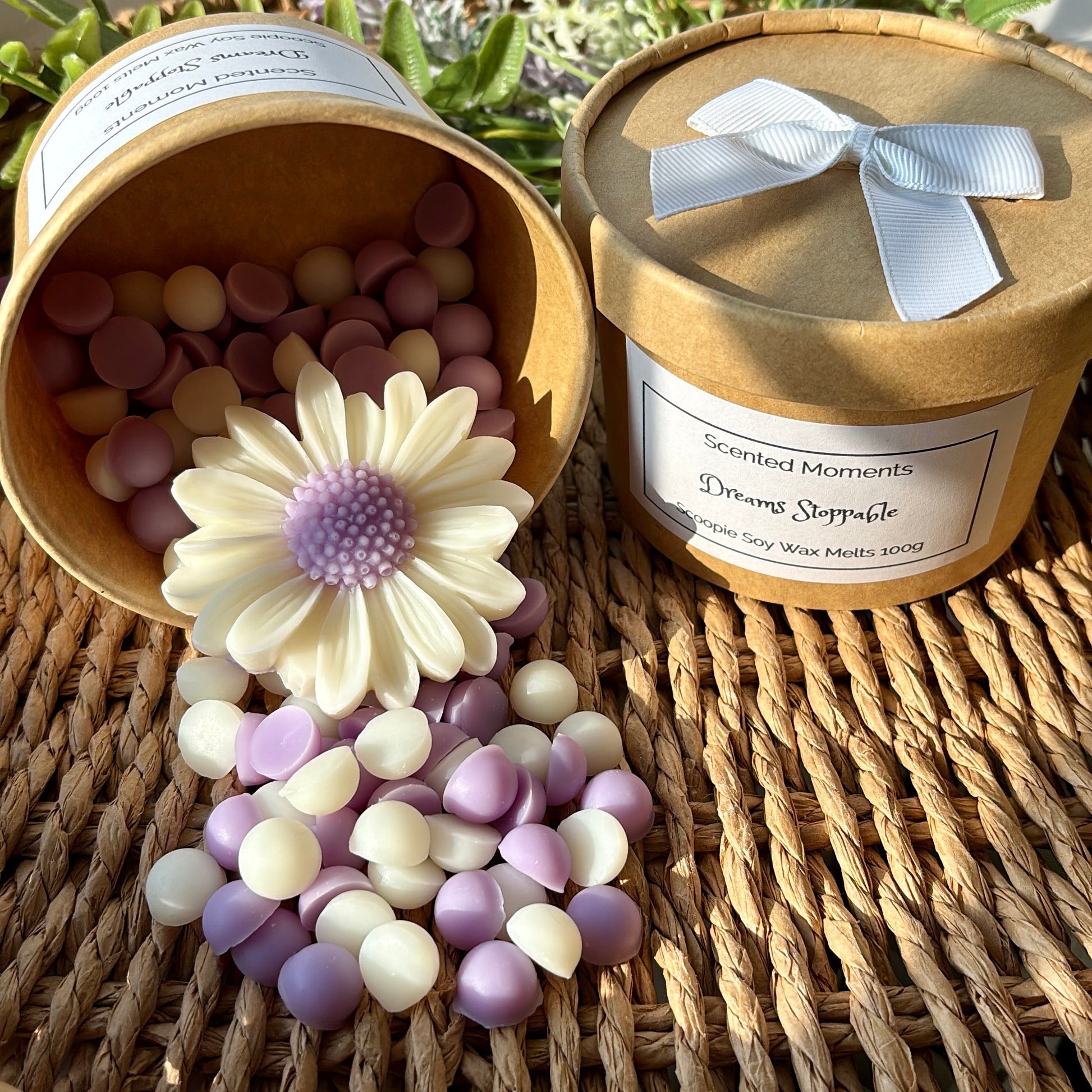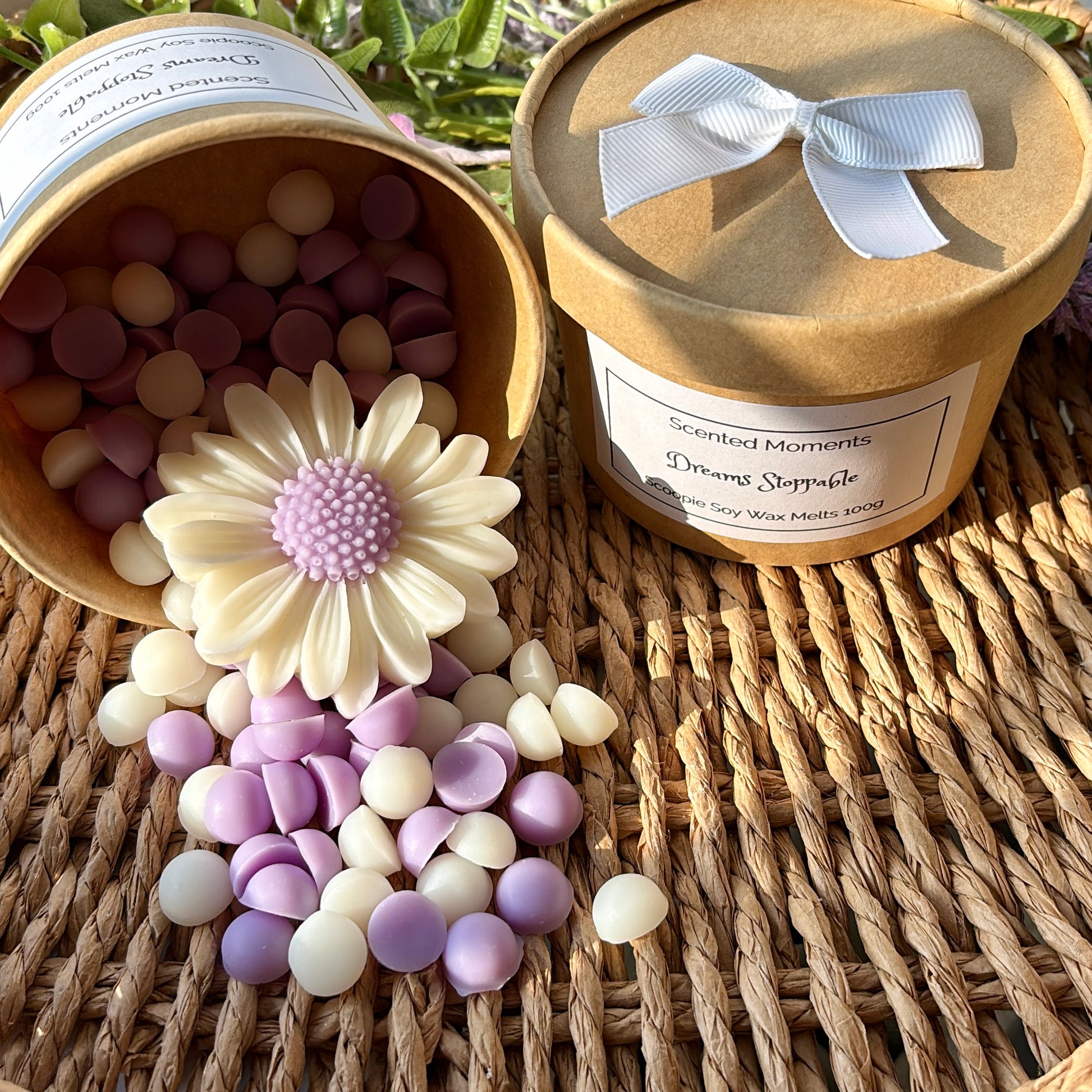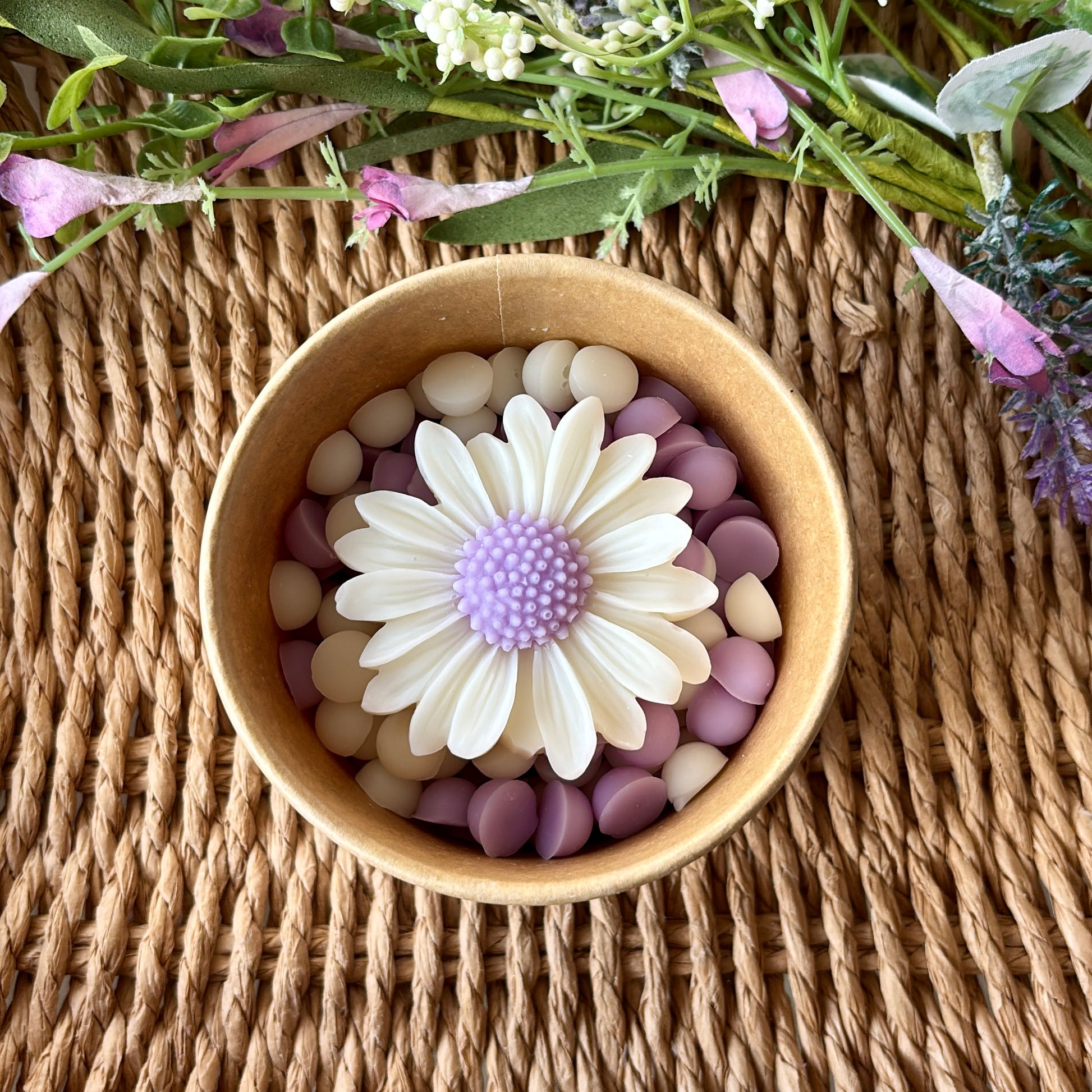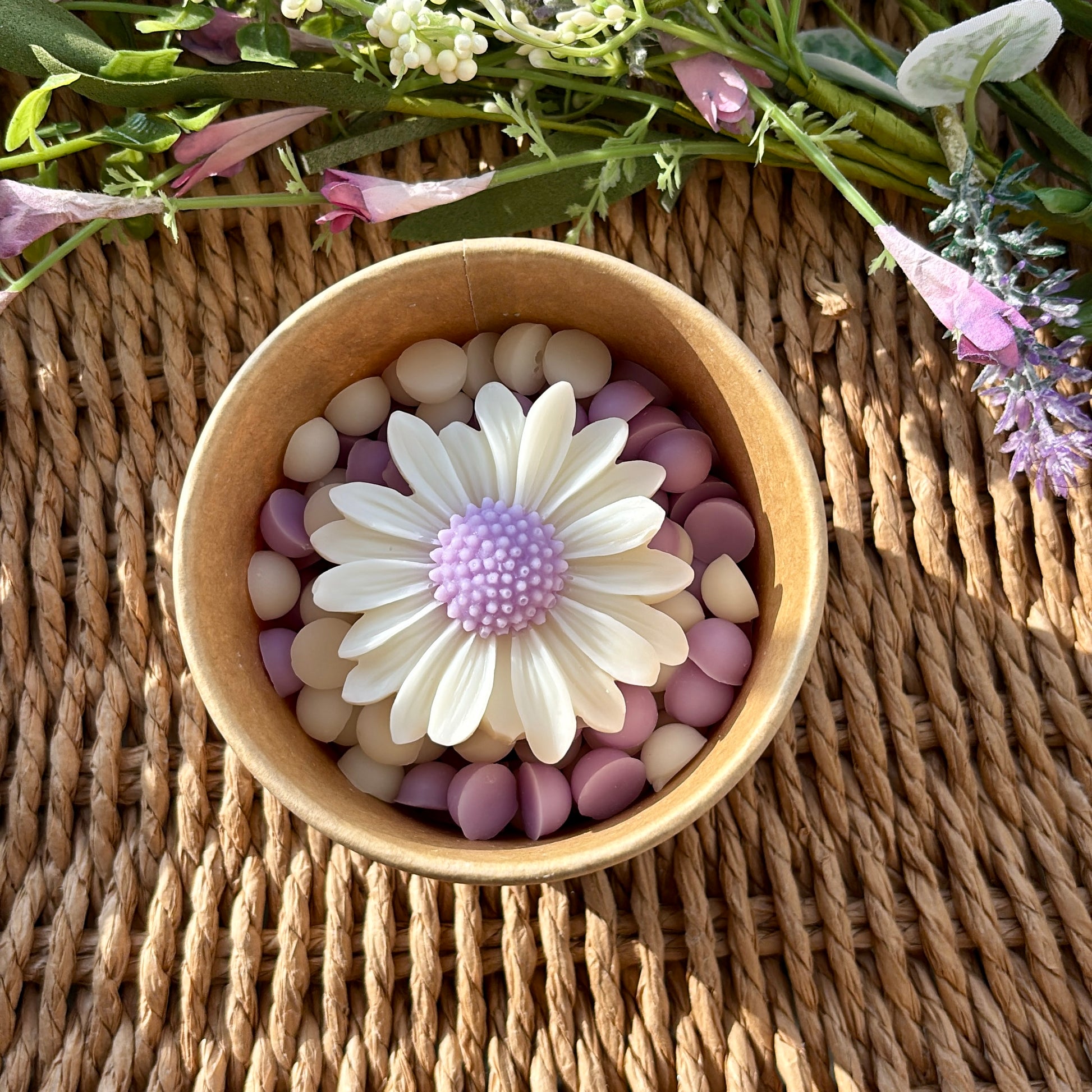 You will receive a selection of pretty pastel purple and white wax melts and a beautiful daisy wax melt Flower, presented in a kraft tub with a white fabric bow.