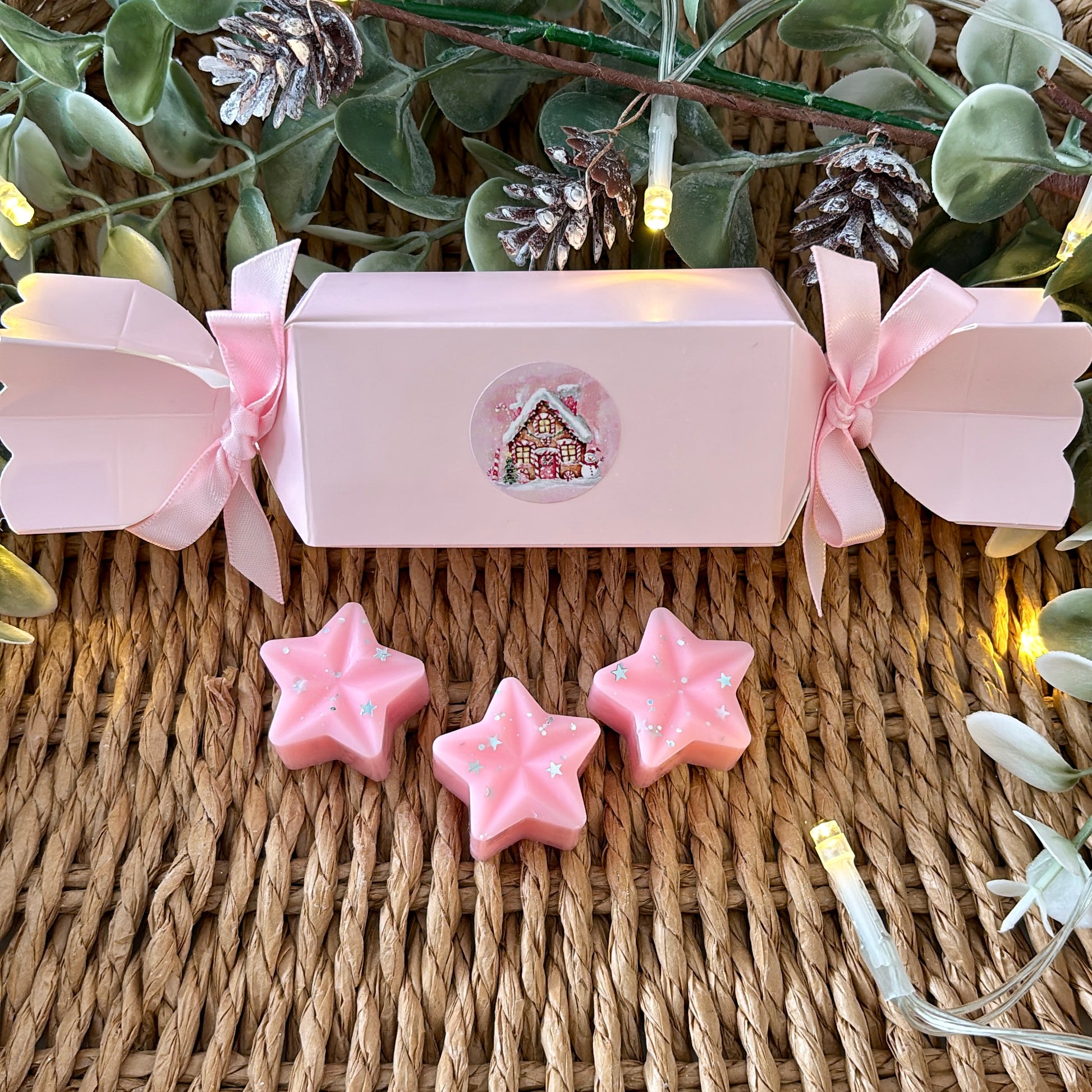 A mini adorable pink Christmas cracker filled with 3 pretty pink star shaped wax melts.