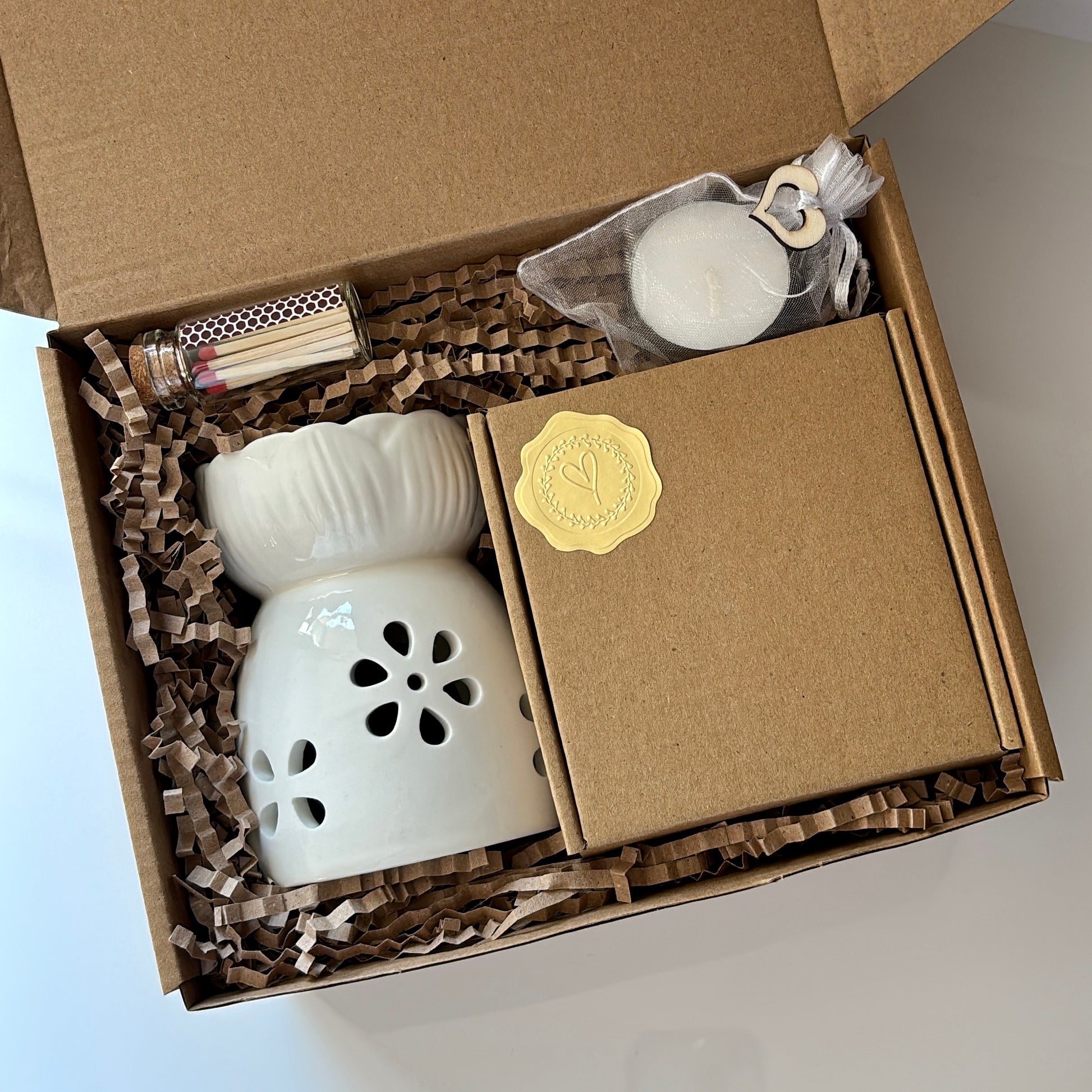 A gorgeous gift idea for Mother's day, birthdays and other gifting occasions. You will receive 1 ceramic Daisy style wax melts burner, 2 botanical love hearts, the choice of wording "Mum" or "Mom" 2 tea light candles and a glass jar of matches.