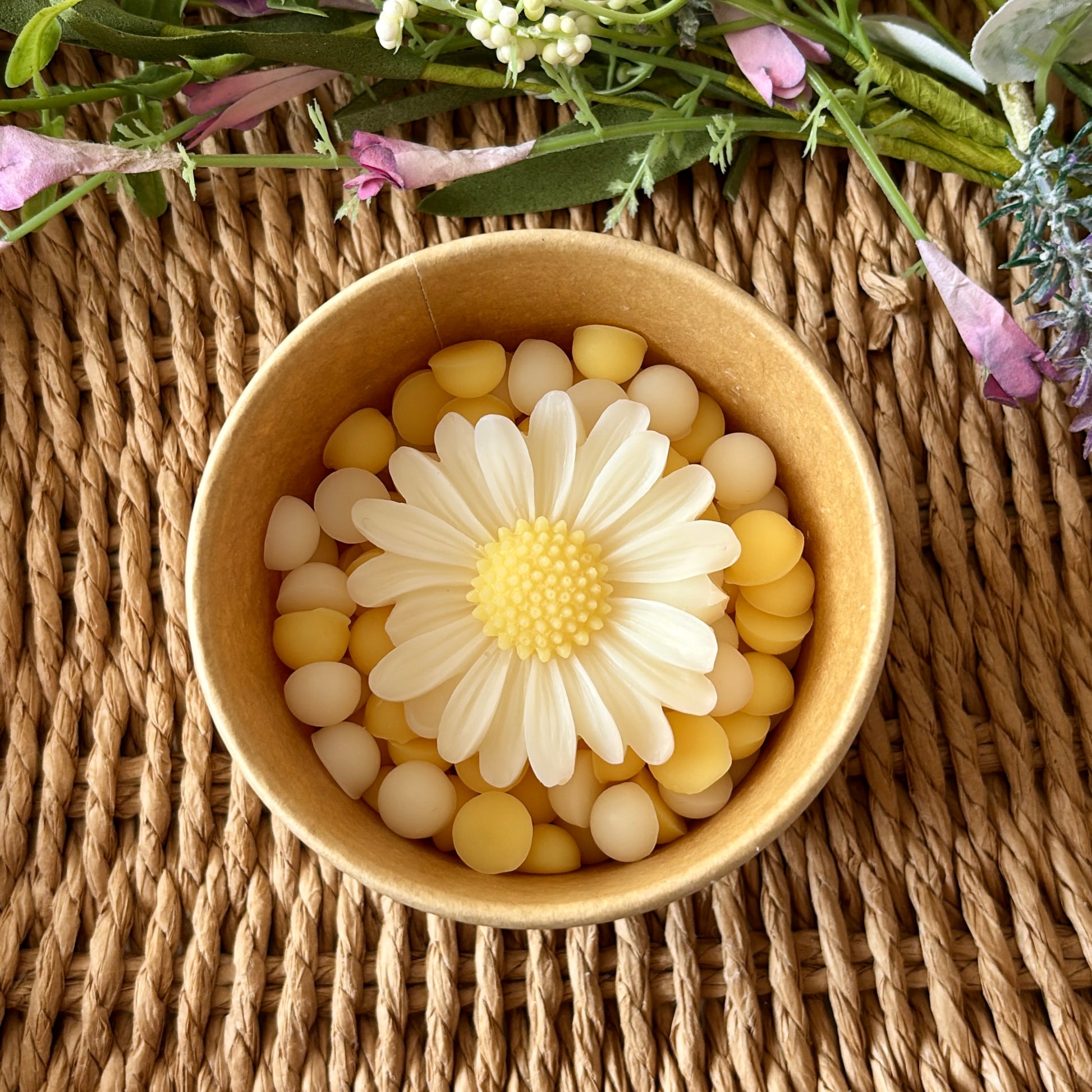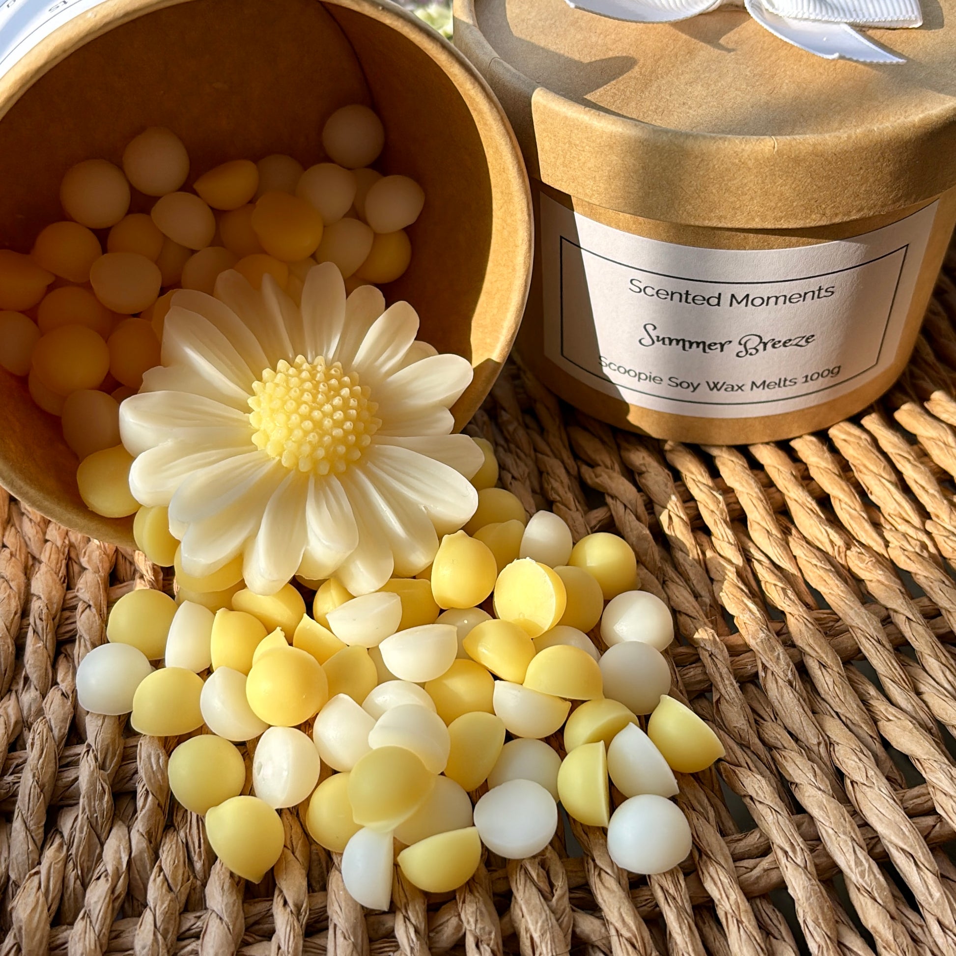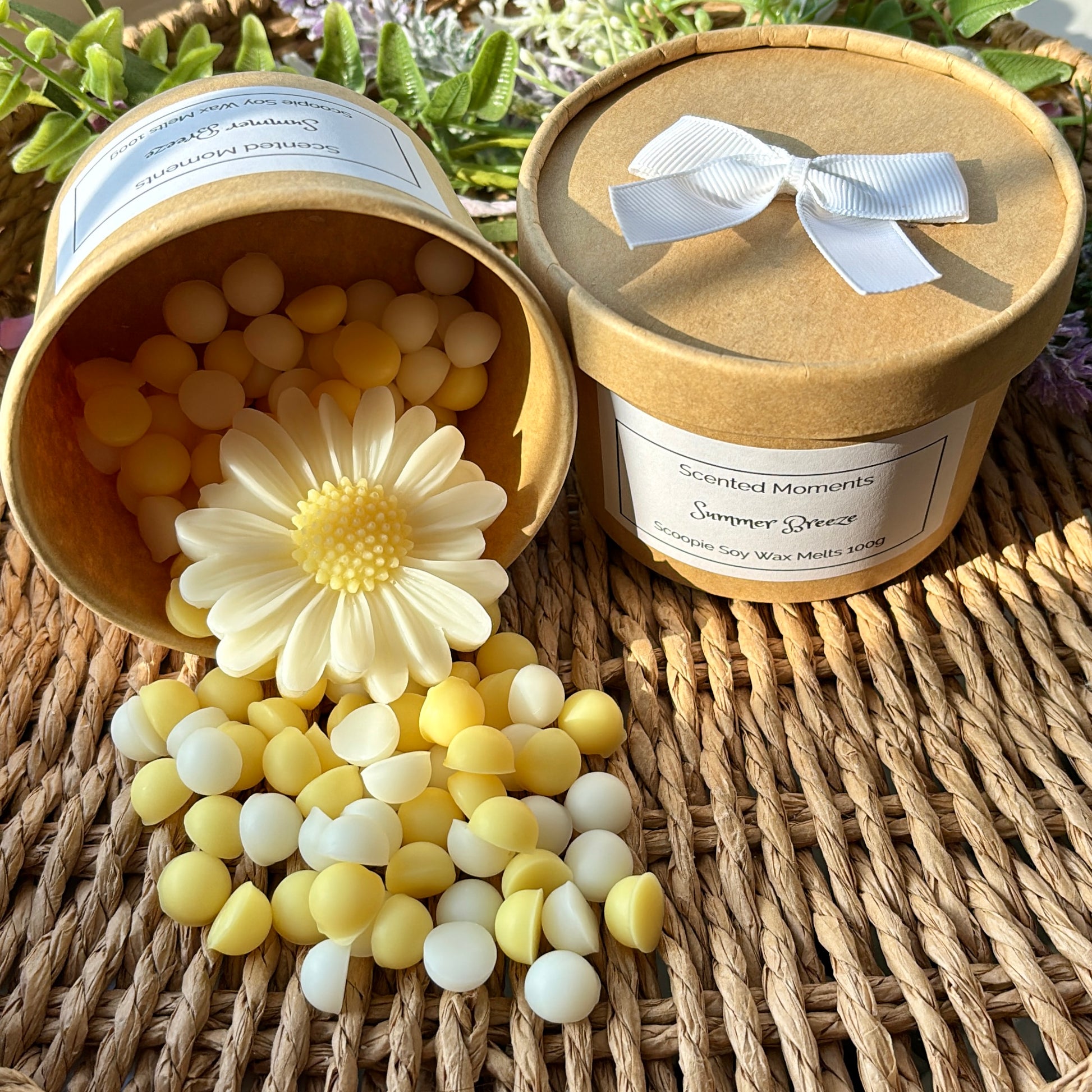 You will receive a selection of pretty pastel yellow and white wax melts and a beautiful daisy wax melt flower, presented in a kraft tub with a white fabric bow.