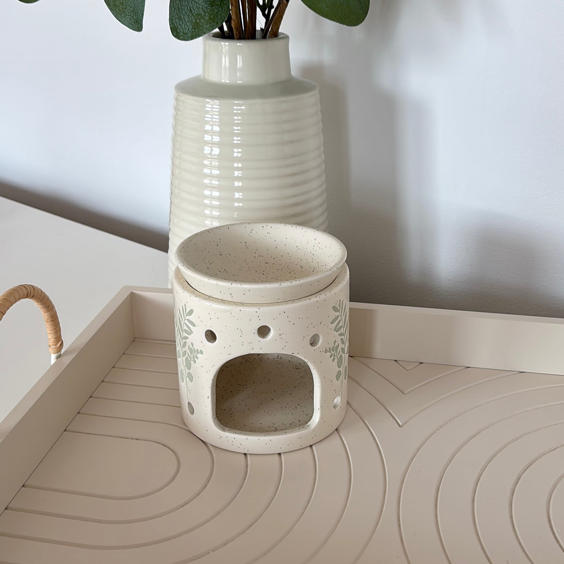 You will receive 1 ceramic Eucalyptus style burner with a removable lid, 1 glass jar of wax melt hearts, 2 tea light candles, and 1 glass jar of matches..